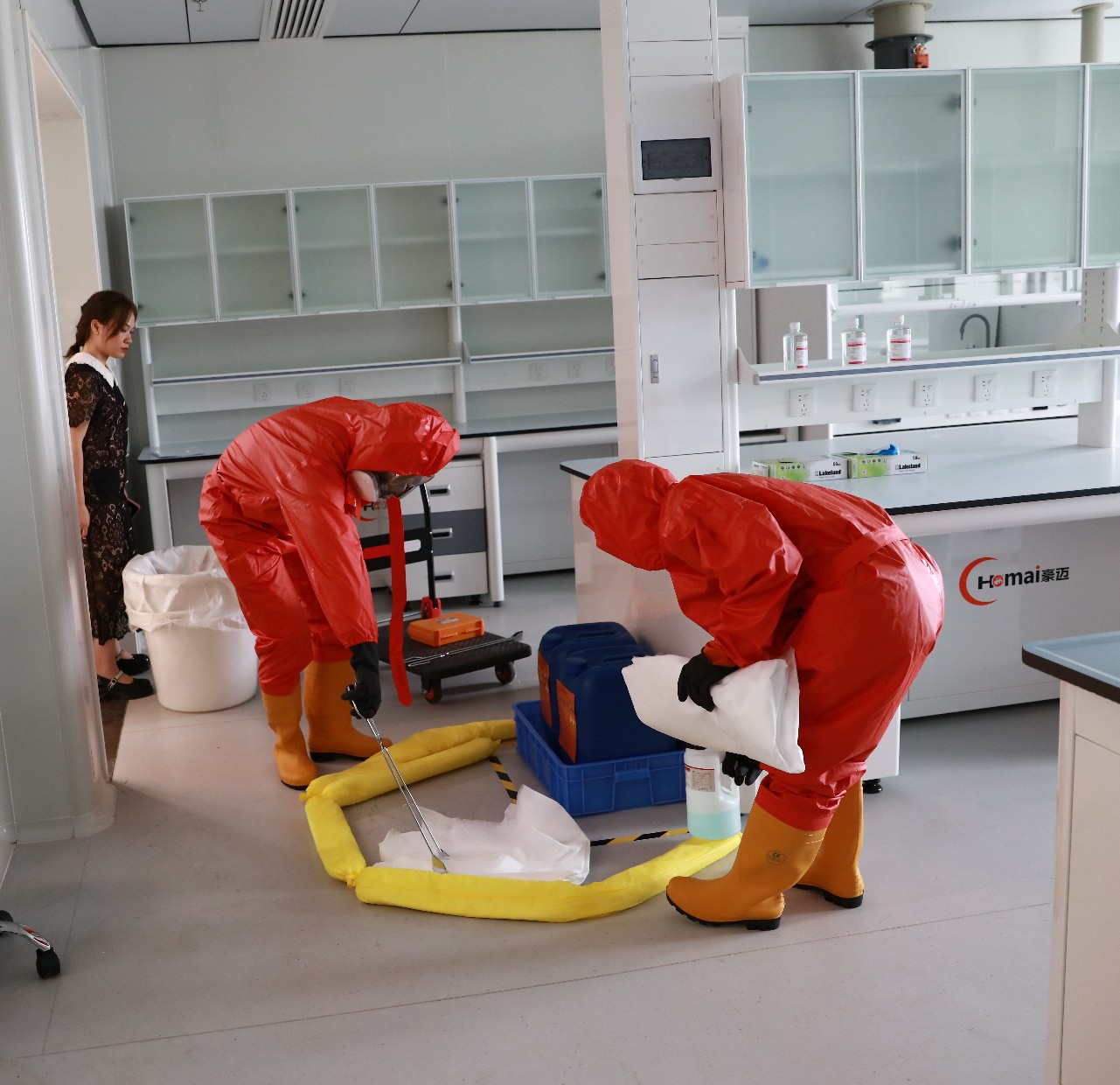培训会后,实验室废液泄漏应急演练活动在岳麓山实验室十号栋466实验室举行,应急演练模拟了实验室废液泄漏的场景,实验室负责人立即启动应急预案,应急组工作人员迅速封锁现场,专门处置人员穿戴好防护用品进入现场进行应急抢险处置,成功控制了泄漏源并对泄漏区进行了环境监测和清理。