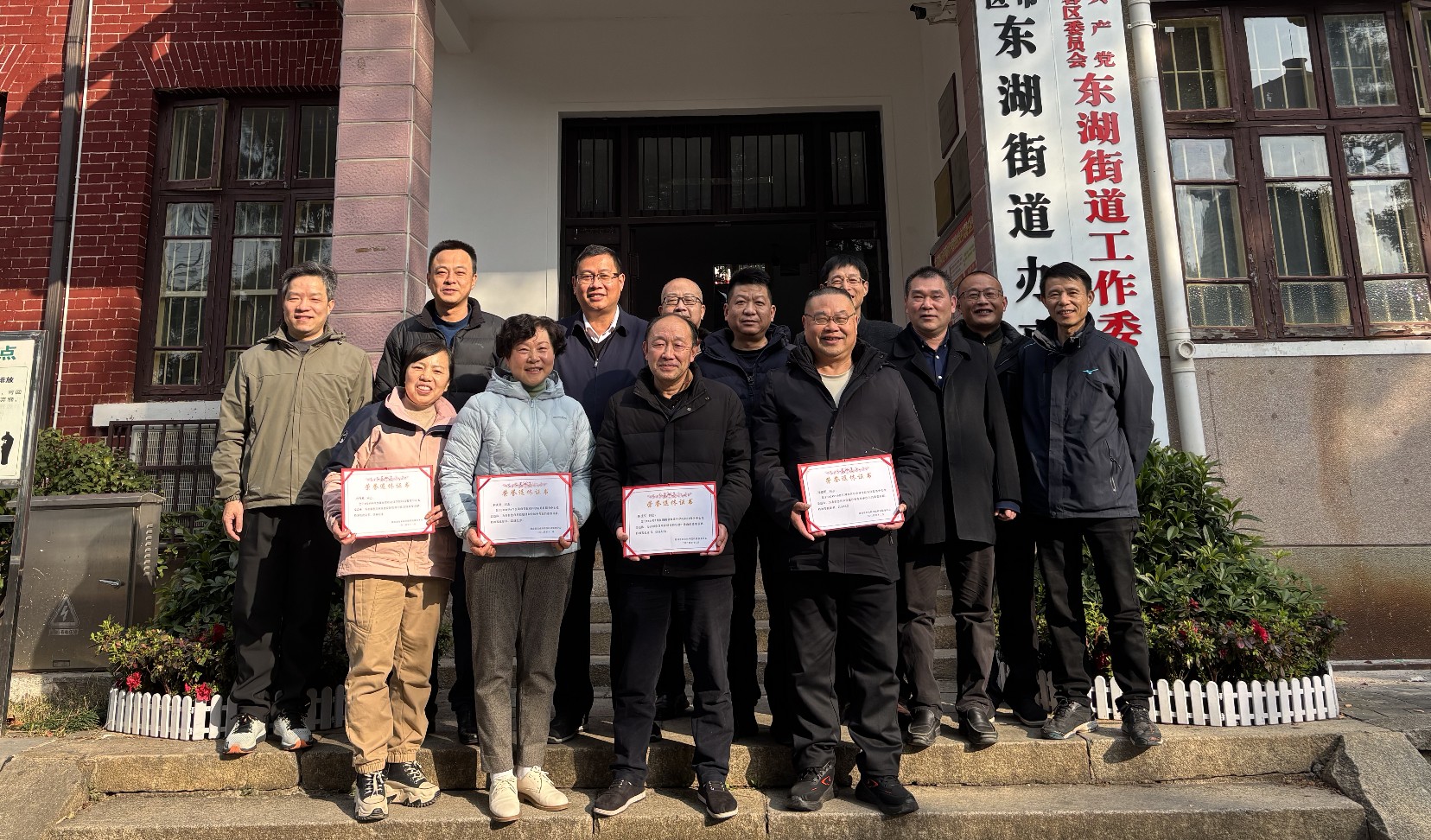 中心领导班子为退休职工颁发了荣誉退休证书、赠上慰问品,并合影留念。